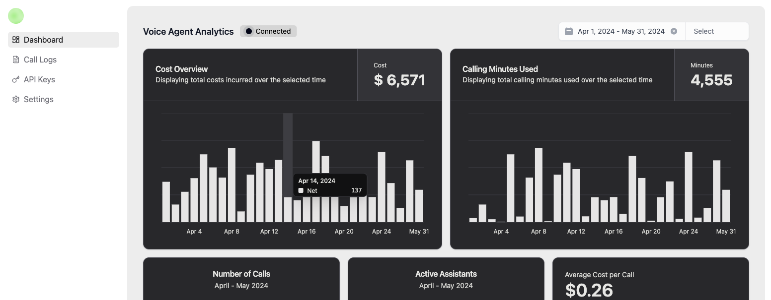 Suivez les métriques essentielles comme l'activité de l'agent vocal et l'analyse des coûts en un seul endroit