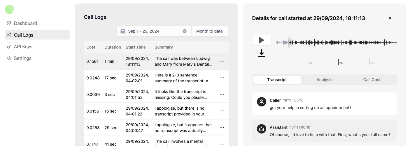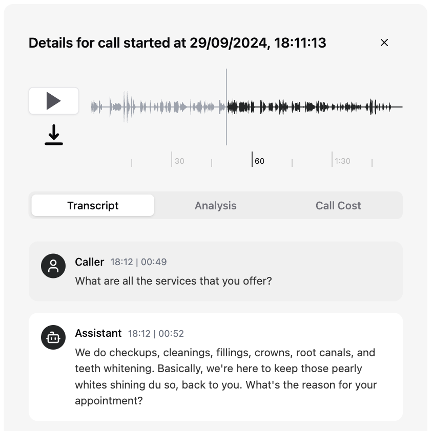 Accédez aux transcriptions, aux métriques de coût, aux détails des appels et à l'audio pour des examens clairs des appels
